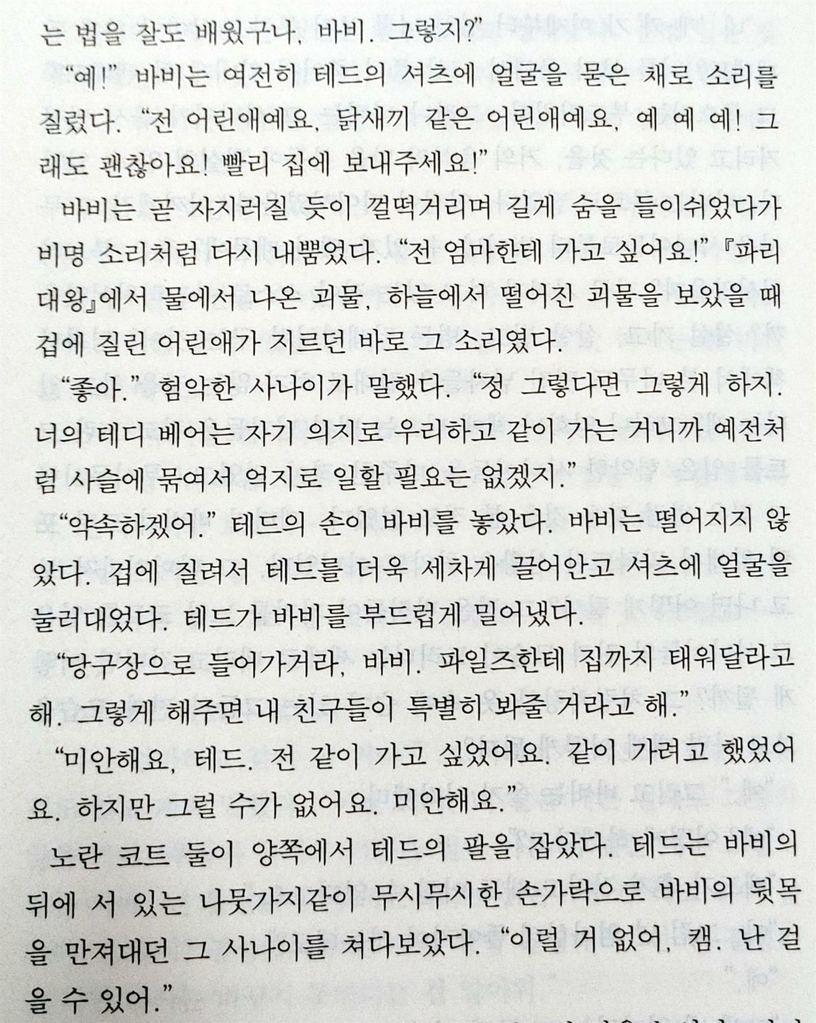 스티븐 킹은 이 소설에서 쳐내도 되는 잡다한 이야기들을 많이 썼다. 그래서 호불호가 갈릴 것 같다. 스티븐 킹의 구구절절 서술이 좋다거나 익숙한 것이 아니라면, 지루하게 느껴질 수도 있을 것이다. 물론 사소한 이야기들이 쌓이고 쌓여서 바비의 일상과 테드와의 우정 등에 대한 진한 감정을 우려내겠지만, 나 역시도 초중반에는 ‘어쩌려는 걸까..‘하는 생각이 들었다.