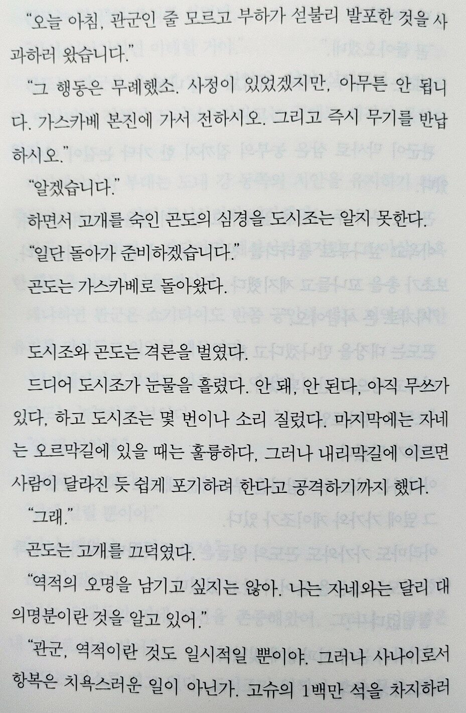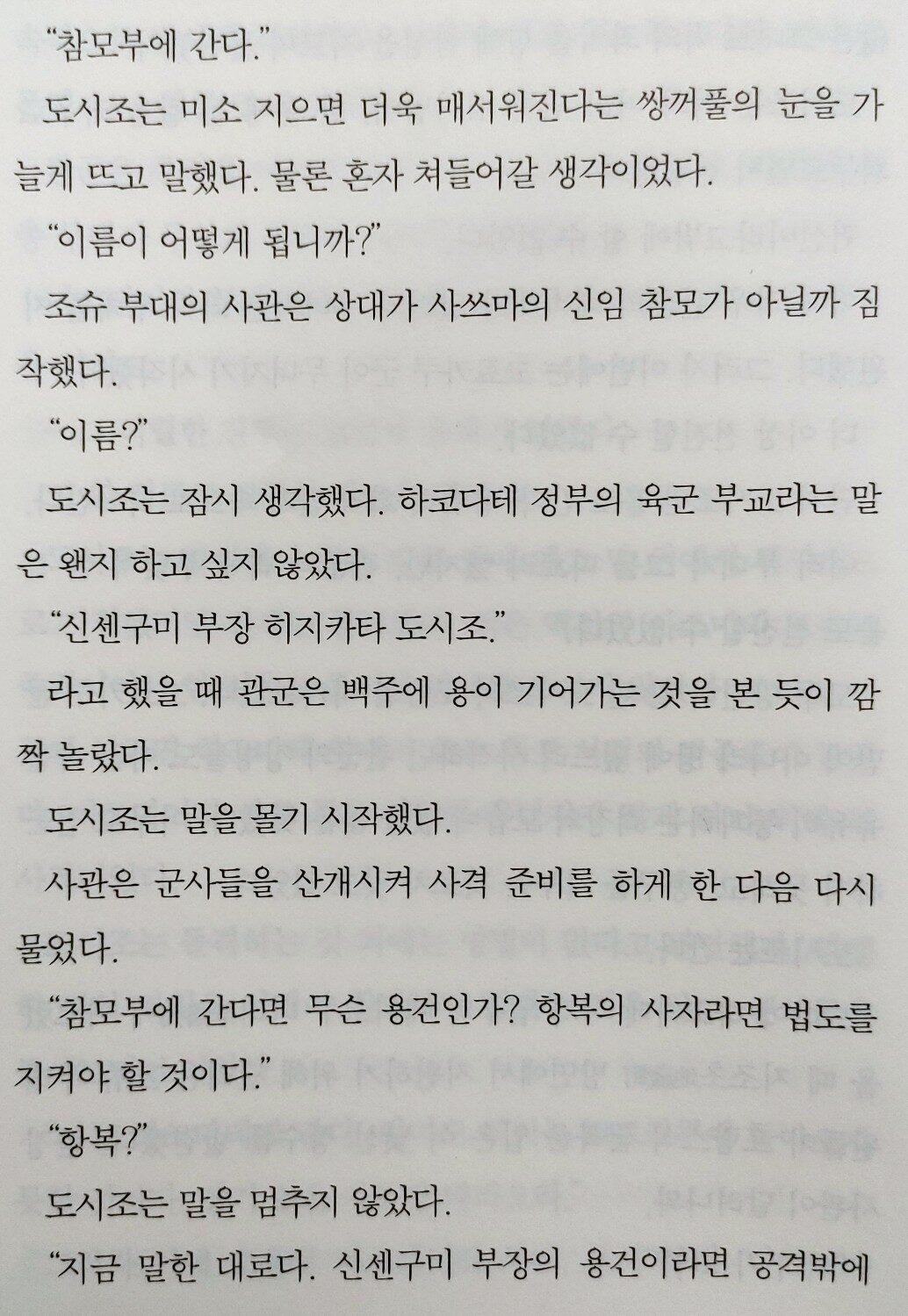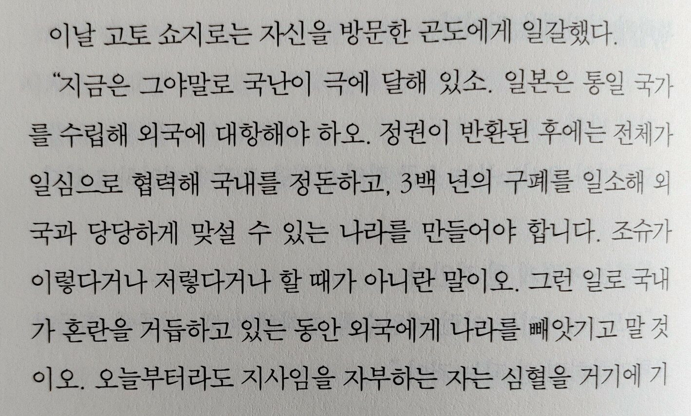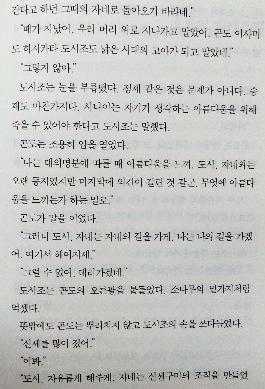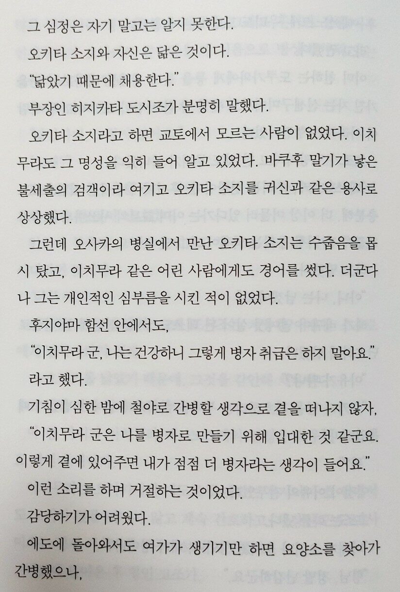 담담하게 서술하는 시바 옹의 필력에 가슴이 아려온다. ‘신센구미의 강화, 무사, 절의‘만을 외쳐온, 강인하기만 하던 ‘히지카타 도시조‘의 인간적인 면모와 고뇌를 보다 보면 가슴이 쓰라리고 죄어져오며, 나도 모르게 어느 순간 그에게 매력을 느껴 응원하게 된다. 특히 생사를 함께 해온 동료들과 사랑하는 여인 ‘오유키‘에 대한 그의 태도에서 인간미가 느껴진다.
