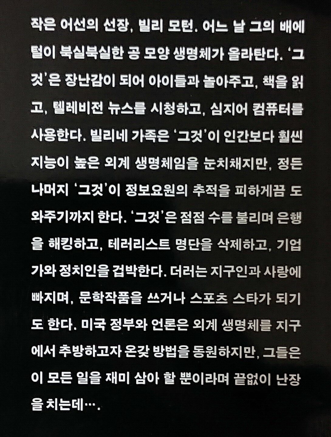 이야기의 초반이 굉장히 흡입력 있고 재미있다. 정체불명의 외계 생명체가 어떤 행동을 할지 기대됨과 동시에, FF들과 관련하여 일어나는 웃긴 상황과 이를 더 웃기게 표현하는 빌리의 글을 낄낄거리며 읽었다.