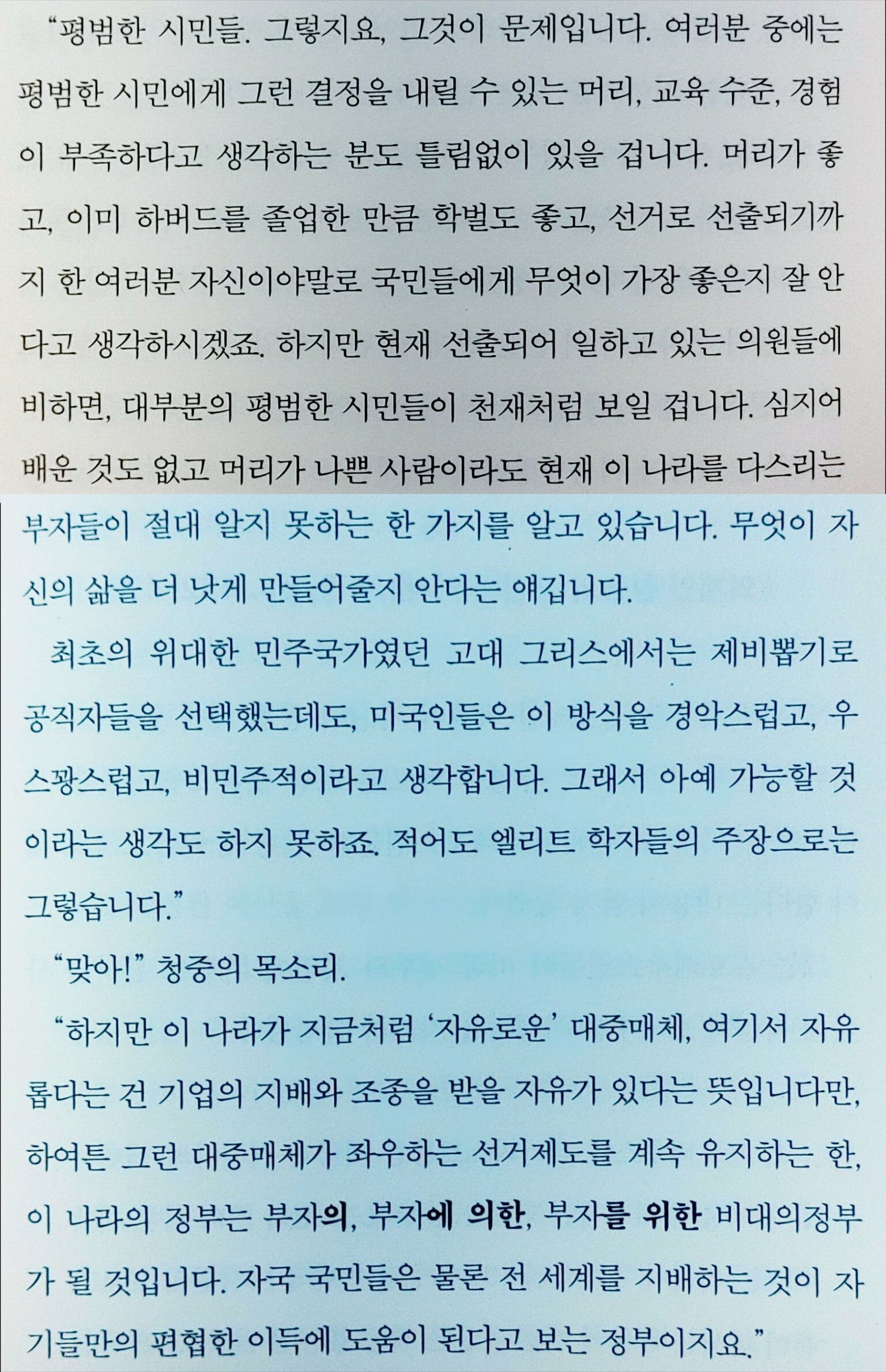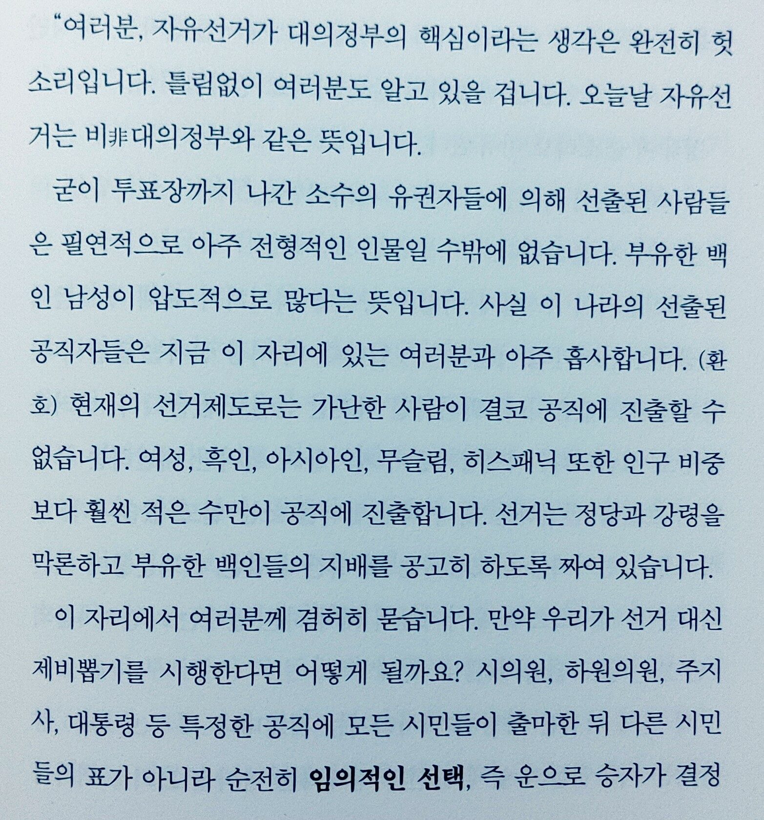 현재 많은 국가들에서 쓰이는 민주주의에 대해 생각해 볼 수 있었다. 나 역시 현대의 민주주의에 큰 한계가 있다고 느끼고 있던 중에, 고대 그리스를 언급하며 임의적으로 뽑는 공직자를 뽑자는 발상은 꽤 참신했다.