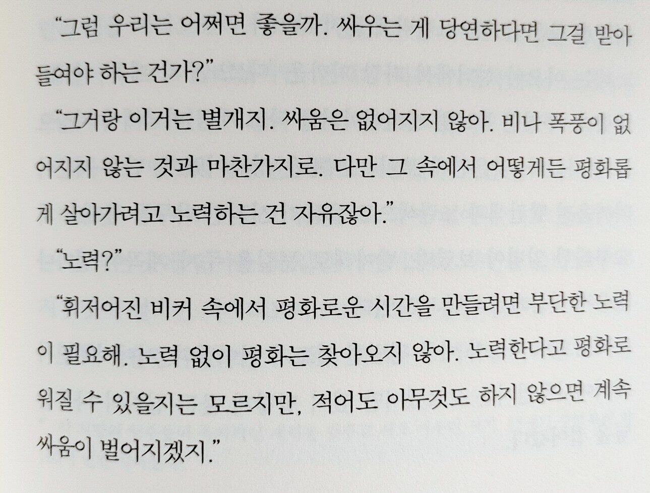 ˝무승부가 어떤 상태를 가리키는지는 모르겠습니다만, 언제나 한쪽이 파멸하는 건 아닙니다. 부딪치지 않도록 서로 수를 쓰거나, 싸움을 피하려고 노력하는 경우도 적지 않으니까요.˝ - 이치오