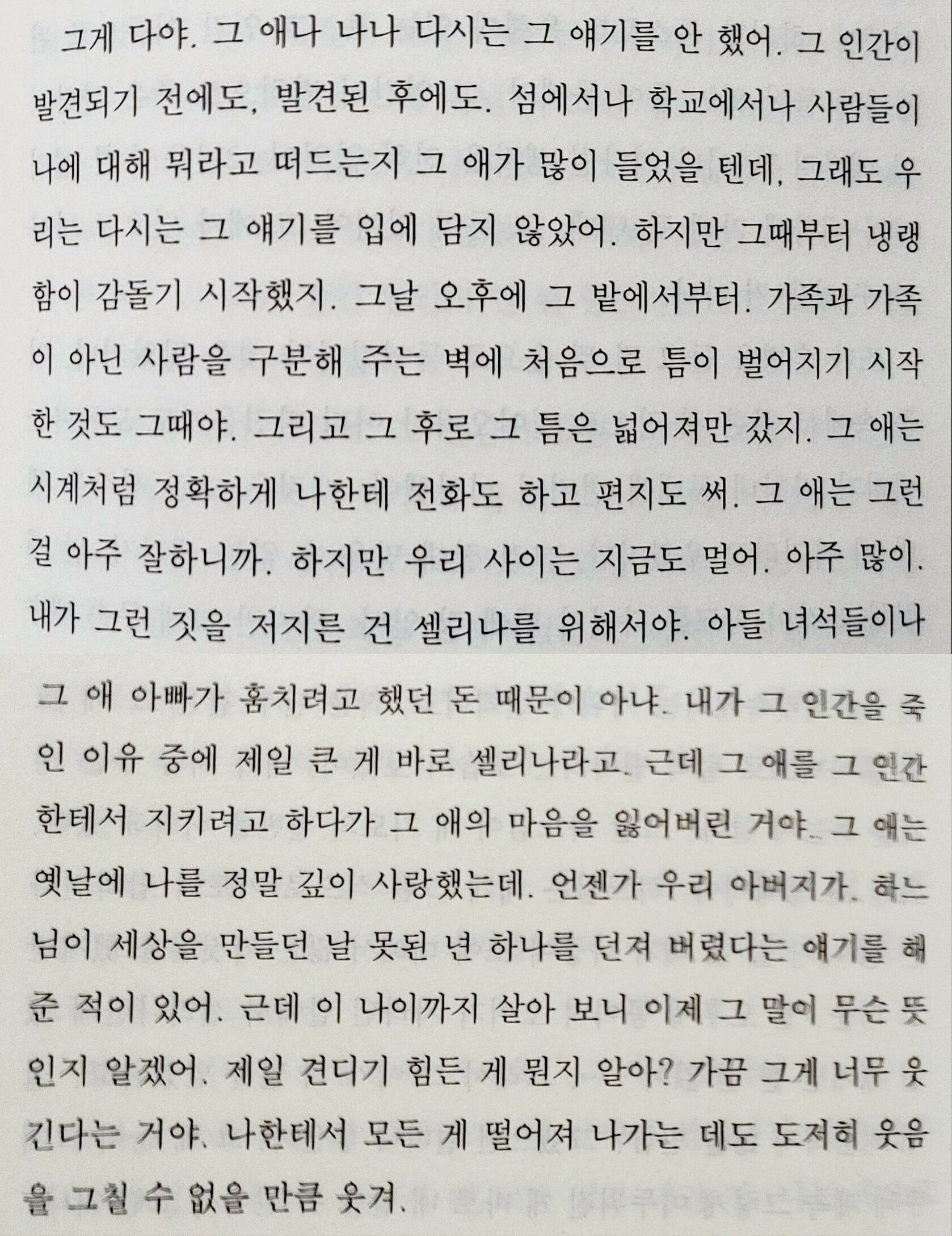 하지만 전체적으로 기존의 그의 소설들에 비해 좀 아쉽다. 시어머니의 과거에 대한 반전은 그냥 그랬다.