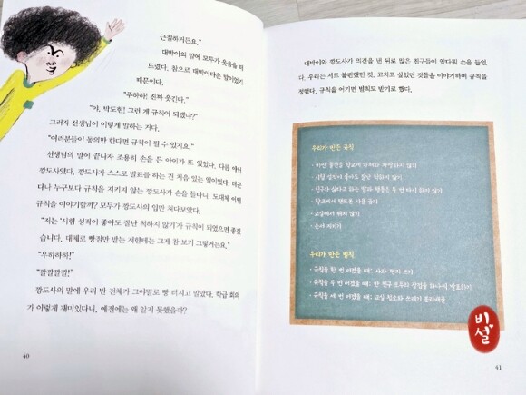 그런데 담임선생님은 참 다르네요. 비호의 단점만 비난조로 말하는 유진이에게도 단호하게 말하고, 또한, 공부만 잘한다고 그 사람의 의견만 들어주지도 않았답니다. 새로운 선생님은 부족한 제 말도 들어주시고 의견을 물어봐 주는 분이네요.