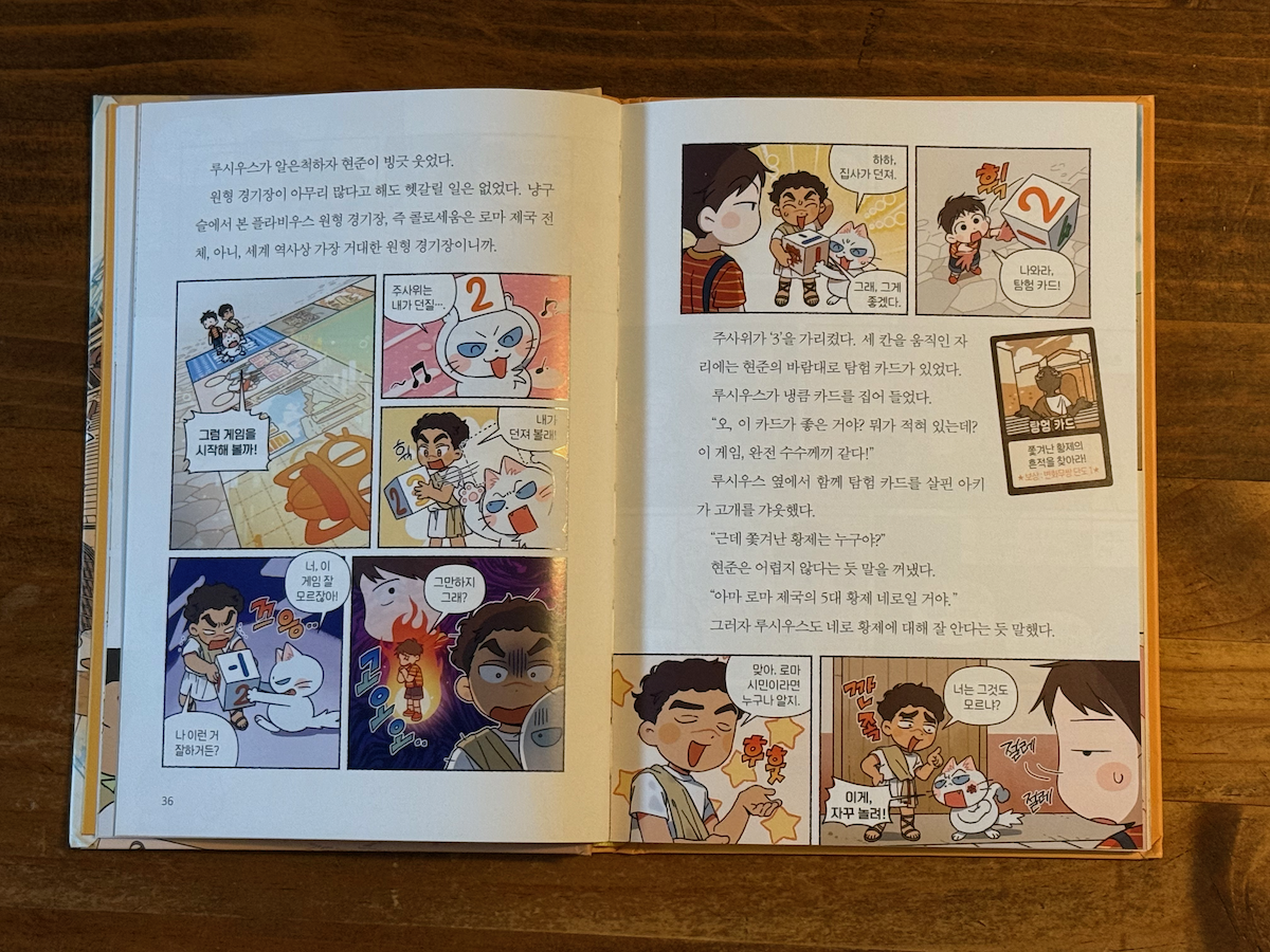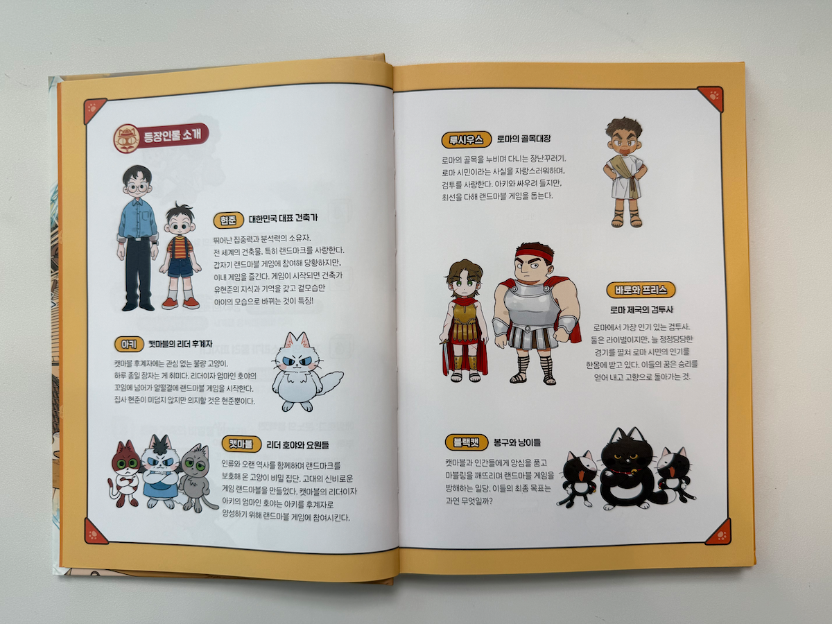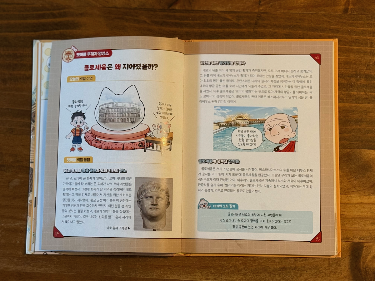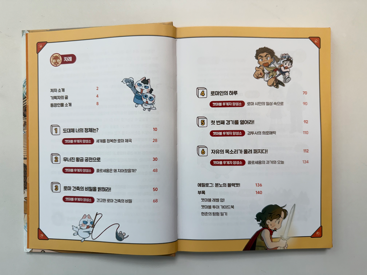 이 책의 가장 큰 장점은 모험 이야기 속에 건축물의 구조적 특징과 역사적 의미를 자연스럽게 녹여냈다는 점이다. 아이들은 흥미로운 스토리를 따라가다 보면 어느새 아치 구조, 원형 경기장의 설계 이유, 관중 동선과 같은 건축적 요소를 이해하게 된다. 만화와 글밥이 적절히 섞여 있어 부담 없이 읽을 수 있다는 점도 매력적이다. 또, 각 장 끝에 실린 <캣마블 후계자 양성소>는 해당 장의 핵심 내용을 한두 줄로 정리해 주며, 조금 더 깊이 있는 설명을 덧붙여 학습 효과를 높인다.