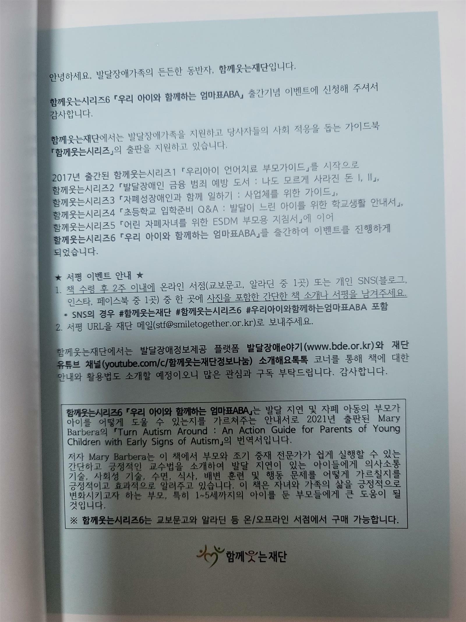 우리 아이와 함께 하는 엄마표 ABA - 자폐와 발달 지연 아동들을 위한 ABA 안내서 ㅣ 함께 웃는 시리즈 6