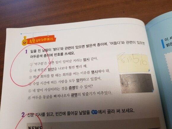 이번주 배웠던 밝을명, 어두울 암 이 한자어를 잘 생각해봐 명이란 글자가 들어가면 밝을명을 썼을것이고 암이란 글자가 들어가면 어두울 암을 썼겠지!! 그럼 단어가 밝고 어두운걸 알 수 있지 않을까?