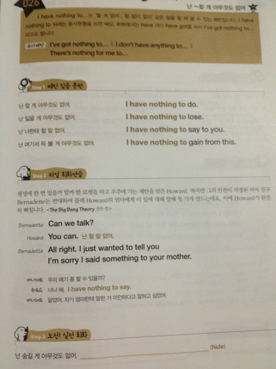 Step2. 리얼 회화 연습 부분에서는 지금 다루고 있는 패턴을 실제 미드에서 방영되었던 대화와 미드에서의 상황,