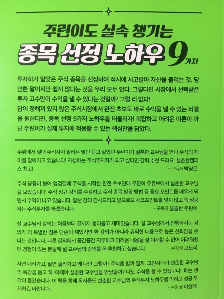 [서평] 주린이도 수익 내는 알짜 주식 선정 노하우 9가지 [설춘환 저 / 이레미디어]