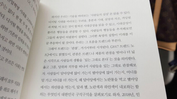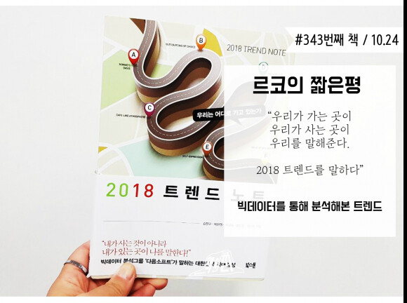 내가 사는 것이 아니라 내가 있는 곳이 나를 말한다고 표현하는 게 정말 맞는 것 같다. TV 프로그램의 취향만 보더라도 그 사람을 이야기하는 경우가 많다. 아마 내가 있는 곳이 나를 말한다의 대표적인 예는 '나래바'가 아닐까. 개그우먼 박나래의 집에 존재한다는 수많은 연예인들도 한번쯤은 가보고 싶어한다는 '나래바', 예능에는 그저 남자연예인들이 오면 놀게 하려는 장소로만 그려졌지만 실제로는 박나래씨가 정말 벌어들인 돈을 먹는 걸로 사용한다고 할만큼 정성과 마음이 들어가는 공간이다. 실제로 나래바에 올 손님을 맞이하기위해서 박나래씨가 노력하는 것을 보면 그녀는 '돈'보다는 '사람'과 함께하는 시간을 사랑하는 사람이라는 것을 보여주는 것이 아닐까라고 생각하게 된다. 미워할 수 없는 매력을 가진 박나래씨를 '나래바'라는 공간을 통해서 만날 수 있는 것이다. 책을 통해서 여러가지 트렌드를 돌아보다보면 나는 어떤 트렌드들에 민감했고 나는 주로 어떤 단어들을 사용했을까도 돌아볼 수 있다. 2018 트렌드노트를 읽으면서 나의 2018 트렌드는 어떤 것이 될지 한번 고민해보는 것도 좋은 하나의 한해를 돌아보는 방법이지 않을까 싶었다. 다양한 트렌드들에 공통적인 부분은 '나'라는 사람의 브랜드에 사람들이 점점 더 관심을 갖고 있다라는 부분이였다. 그 모든 장소, 사는 곳, 경험하는 곳에 있는 나를 소중히 여기고 싶어하는 사람들의 마음이 반영된 것 같아보였다. 누군가에게 보여지는 나를 생각하다보니 생겨난 트렌드들이 아닐까라는 생각을 하니 2018년에는 또 어떤 트렌드들이 더 생겨날지 흥미로워졌다.