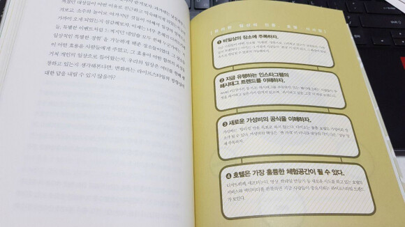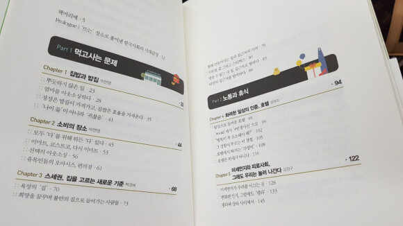 시대의 흐름인 트렌드를 장소와 #해시태그같은 키워드들로 돌아본다는 게 어떨까 싶었는데 읽으면서 굉장히 흥미로운 부분들이 많았고, 나름 유행이나 트렌드를 다 쫓아가진 않는다고 생각했는데 생각외로 나는 트렌드에 맞춰 보고, 생각하고, 경험한 부분도 꽤 된다는 것을 인지할 수 있게 되었다. 게다가 트렌드를 읽으려면 현실을 직시해야한다고 말하는 것처럼 현재시점에서는 정말 많은 부분 바뀌기도 한 부분이나 여전히 많은 사람들이 고정관념처럼 인식하고 있는 부분등 다양하게 생각해볼 수 있었다. 특히나 '집밥'이라는 내용이 공감이 갔다. 생각해보면 인스타나 페이스북에 누군가에게 자신의 경험을 자랑하고 드러내는 세대가 되고 시대가 되니 메뉴 / 맛집에 대한 키워드는 더 확고해졌지만, 엄마나 요리, 국물이라는 부분의 연관어는 점점 사라졌다. 말그대로 시간이 갈수록 취향이 확고해지고 있음을 보여줬고 시대가 변했음을 느꼈다. 집밥이라고 흔히 하면 타지에 사는 자녀가 오랜만에 집에 들려 엄마가 차려준 밥에 쓰는, 별거 아닌 것 같은 반찬이지만 집밥 특유의 따뜻함이 있는 음식들을 이야기하는 부분이였지만 이제는 젊은 엄마들은 대부분 워킹맘이고 육아와 집안일까지 다 병행하는 것이 여간 수고스럽지 않을 수 없음을 아주 정확히 대변해줬다. 나 혼자 자취생활 어느새 4년차라서 처음에는 배달음식도 시켜먹고 나가서 먹기도 많이 먹었지만 점점 더 집밥같은 밥을 먹거나 아니면 사진에 남길만한 음식들을 대부분 먹게 되었던 것 같다. 자연스럽게 변했던 행동들이 트렌드에 맞게 살고 있던 거라니, 어떤 이유에서든 사람들의 생각과 마음이 현시대의 감성을 투영하는 행동들을 보여주는 것에는 부인할 수 없는 사실임을 인정하면서 더 읽게 되었다. 마치 더이상 거실공간처럼 온 가족이 모여서 시간을 보내는 일이 줄어들자 자연스럽게 새로 지어지는 집들에는 방을 오히려 크게 빼는 구조로 지어지는 것이 그런 부분들이겠구나라고 생각되었다.