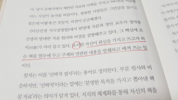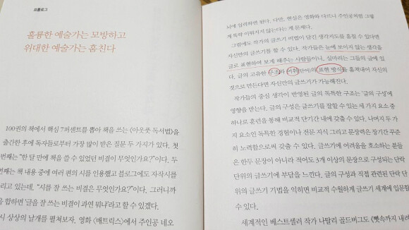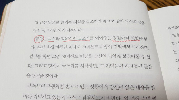 사실 나도 책을 읽으면서 '책'에 직접하거나 '노트'를 통해서 메모를 하는 타입의 사람 중에 하나라서 필사에 관심이 많다. 메모하는 방법을 꾸준히 이런 모양 저런 모양으로 해보면서 나만의 메모, 생각정리 방법들을 고민해보고 있어서 인지 필사는 항상 관심사에 들어있다. 매일 아침 15분 정도씩 필사를 해본 경험이 있는데 아침시간 깨어난 머리를 상기시키기에도 좋고 굉장히 집중력도 높아서 많은 부분들에 도움이 된 기억이 있다. 확실히 책만 읽을 때보다 이 책에서 나오는 바 눈만이 아니라 손으로도 읽어라라는 부분이 가장 공감이 갔다. 많은 책을 읽었지만 읽고 그냥 서평을 남겼을 때보다 메모하면서 책을 읽고 그 책을 서평까지 남겼을 때 효과는 2배이상 차이가 났다. 내가 필요한 순간 책의 제목이나 저자, 그리고 내용, 혹은 문장까지 지갑에서 돈이 필요하면 꺼내 쓰듯이 내가 의식하든 의식하지 못하든 순간적으로 생각하는 부분들, 활용할 수 있는 부분들이 필사를 하면서 많이 늘어났었다. 게다가 나의 생각을 정리할 수 있는 부분들이 있기에 책에서도 말하는 바 "필사의 직접적인 효과"="치유"라는 부분이 좋았다. 그래서 나도 많은 사람들에게 메모, 필사를 권한다.