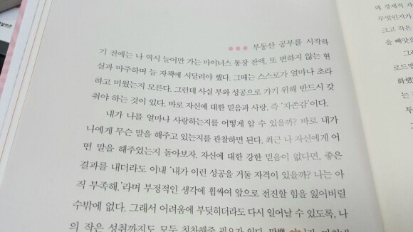 어쩌면 많은 사람들이 '부동산, 주식, 펀드 등' 많은 재테크 들에 대해서 실망하고 사기당하고 큰 돈을 잃어봤기에 실질적으로 돈이 되는 것은 부자만 가지는 전유물이라고 생각하는 지도 모른다. 하지만 돈에 대해서 생각해보면 - 돈은 단순히 얻어지는 것이 아니며, 돈은 분명히 공부를 해야함을 알 수 있다. 어느 것도 공부하려 하지 않고, 이해하려 하지 않는 다면 그 어떤 상품도 나에게 큰 도움이 되어지지 않는다. 고객들을 만나보면 보험이 많다고는 하는데 어떤 보험을 들었는지는 생각하지 못하는 경우도 많이 만나보았기에 - 엄마의 첫 부동산 공부 책에서 말하는 새로운 셰계를 만나는 과정이라는 말이 참 와닿았다. 부동산은 꼭 공부해보고 싶은 분야 중 하나였기에 이 책에서 나오는 하나하나의 내용들과 작가의 마음이 와닿았다. 분명하고 간절한 목적과 동기를 세우고 하나하나 이루어나가는 과정을 디테일하게 보여준다.