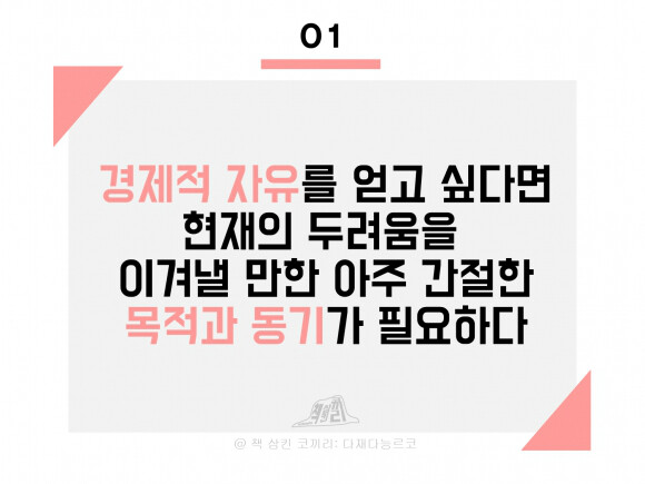작가에게서 배운 것은 지켜야할 가족이 있었고, 생활이 이미 진행되는 상황이였기에 큰돈이 아니여도 월급처럼 매달 꾸준히 들어오는 월세 시스템을 만들려고 노력했다는 것이였다. 수익을 한방에 많이 얻을 수는 없다. 목돈을 일단 모으려고 해도 시간이라는 것이 필요한 것처럼 돈을 모으고 투자를 한다는 것은 그만큼 인내가 필요하고, 꾸준함이 필요하는 것이다. 또한 경제적 자유를 갈망하면서 정작 돈의 성격에 대해서 잘 알지 못했고, 돈에 대한 지식도 없었고, 돈에 대한 공부도 하지 않았다라는 부분이 참 많이 공감을 했다. 이전에는 나도 돈을 잘 알지 못했다. 자산관리를 하고 보험으로 고객들을 설계해주면서 '돈'이라는 것에 대해서 더 생각하게 되었다. 경영학과를 나오고도 경제흐름과 경영의 흐름을 읽어나가야한다라는 것을 나중에서야 깨달았다. 책을 읽고 강의를 듣고, 꾸준히 공부하고 실무적으로 도전해 보고나서야 '아, 돈이라는 것이 이런 것이구나'라는 것을 알게 되었다.  누구나 비슷한 마음이겠지만 행동에 옮긴 작가가 분명한 결과를 낸 모습을 보니 더욱 공감이 되었다.