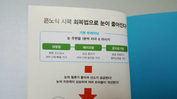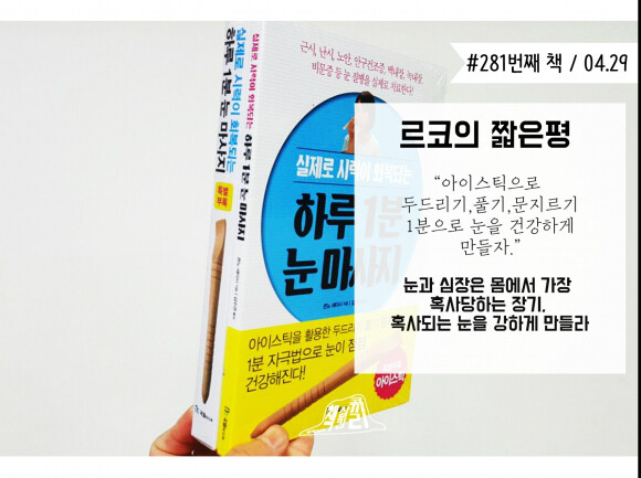 눈을 위한 운동을 한다라는 부분을 전혀 생각치 못한 부분 중에 하나인 것 같다. 매일 매일 사용하면서도 어떤 무언가를 해줘야한다는 생각을 하지 못했던 것 같다. 게다가 요즘 주변에 안경을 쓰고도 안구건조증에 시달리는 친구들이 주변에 많아지는 부분을 보았는데, 이 책에서 배운 것을 조금은 나누어줘야겠다라는 생각도 들었다. 자극하고 풀고 혈액순환을 위해서 하는 간단한 3가지를 통해서 눈의 건강을 찾으려고 하는건데 - 게다가 책과 함께 "아이스틱"을 주다보니 진짜로 쉽게 쉽게 해볼 수 있을 것 같다.