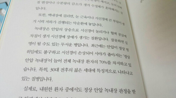 젊은 세대에게도 노안, 백내장, 녹내장 등이 증가하고 있다는 사실에는 조금 놀랐다. 백내장, 녹내장은 옛날 사람들에 비해서 신체의 노화가 빨라지는 걸까하고 여길 수 있지만 어릴적부터 눈을 혹사시킬 수 있는 환경에 노출되다보니 눈의 혈류장애 나 산소 부족을 불러와 제 기능을 하지 못하는 노안이 생긴다는 것을 보면서 유난히 어린 친구들이 안경을 쓰는 부분도 이해가 가기도 했고, 게다가 안경을 나는 항상 쓰는데 가끔씩은 안경을 벗는게 훨씬 낫다라는 부분에 대해서는 나도 잘 몰랐던 상식이였던 것 같다. 물론 자가치료라는 게 다 되는 것은 아니겠지만, 해본다면 분명 달라지는 부분도 있지 않을까 싶다.