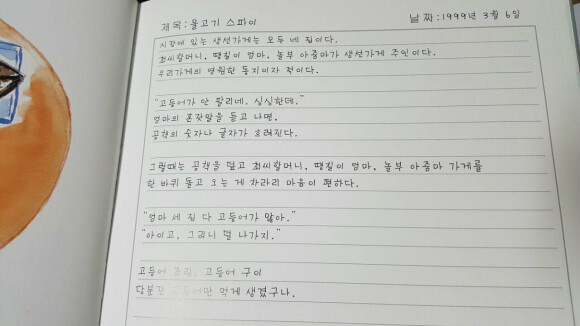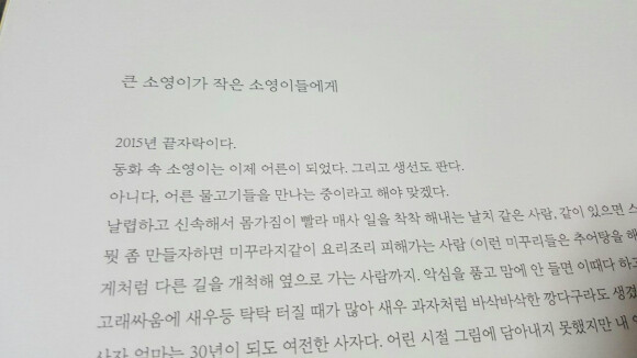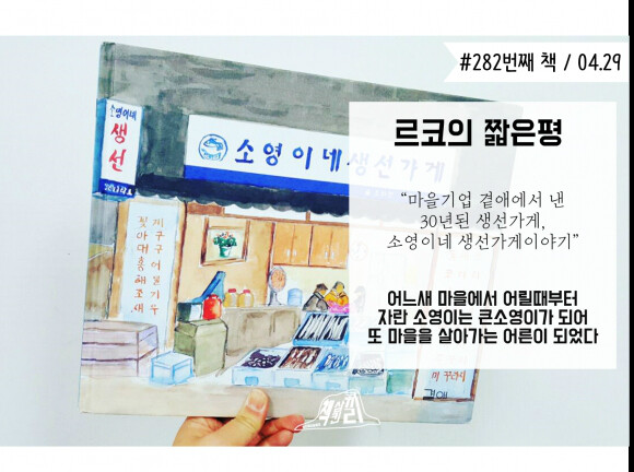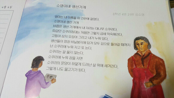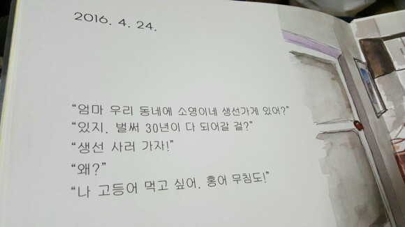 그림일기를 모티브로 쓰여진 글들은 짧지만 정말 많은 부분을 이야기한다. 일상이지만 현실이고, 일상이지만 마음아프기도 했던, 또한 그 일상 속에서 생활과 습관까지도 보여진다. 상장을 받아온 소영이가 쓴 글이 참 와닿는다. 이 글을 듣고 있던 엄마의 마음은 어땠을까 또 돌아보기도 한다. 30년된 소영이네 생선가게를 보면서 문득 오래됨을 다시 돌아본다. 마을의 젊은이들이 마을의 어르신들을 기록하는 동네방네 그림책의 의미를 돌아보기도 한다. 30년이라는 시간을 지나 온 부모님의 이야기도, 어느새 작은 소영이에서 자라 마을의 청년이 되기까지 그 많은 이야기들에서 우리네 삶을 돌아본다. 문득 내가 살아온 시간도 돌아본다. 지나온 시간이 그저 지나온 것이 아니라 하나하나 새겨지고 하나하나 정말 많은 부분들이 있었구나라는 생각을 들게했다. 소영이의 시선을 쫓다가보면 괜시리 가슴이 찡하다. 아이의 시선에서 바라보는 항상 가게를 지키고있는 엄마의 모습, 새벽부터 바빠 어린 아이들을 챙겨주지 못하는 엄마의 모습, 생선가게 딸이라서 어린 마음에 친구들에게 받았을 여러가지 소영이의 마음까지 - 그림책 하나에 담기에는 참 많은 모습이, 그리고 마음이 담겨져있다. 2017년 어느새 소영이는 어른이 되어있다. 큰 소영이가 작은 소영이들에게 전하는 편지로 그림책이 마무리된다. 소영이의 어린시절이 생선처럼 정말 그대로 팔딱팔딱 뛰고 있는 이 책에는 소영이와 엄마의 진한 마음이 그대로 담겨져있다.  큰소영이를 보면 더 느껴진다. 문득 책을 다 읽고나면 왠지 소영이네 생선가게에 가고 싶어진다. 서울이 아닌 나는 문득 오늘은 생선을 꼭 반찬으로라도 먹어보고 싶어진다.