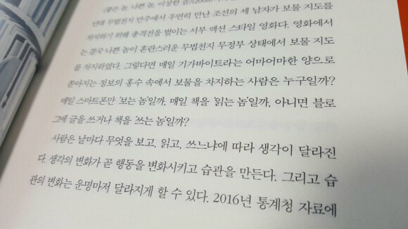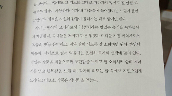 나역시 어린시절부터 쭉 이어왔던 독서에 슬럼프에 빠진 적이 있었다. 분명 한달에 20권이 넘는 책을 읽어갔지만 뭐랄까 채워지지 않는 공허함이 계속되고 책을 읽었지만 나에게 남는 게 없는 순간이 지속되어간다는 걸 깨닫는 순간이 나에게 왔음을 알게 되었던 것이였다. 그래서 나도 저자처럼 한동안 책을 멀리한 적이 있었다. 하지만 책을 통해서 많은 변화를 얻고 책이 나름의 휴식과 힐링이였기에 금새 다시 독서를 하기 시작했지만, 저자가 느꼈던 부분에 공감을 할 수 밖에 없었다. 나도 많은 사람들에게 독서를 권하는 사람이지만 다들 바쁘다고 혹은 읽히지 않아서, 어려워서 여러가지 이유로 독서를 어려워하는 사람들이 많다. 그래서 어느새 120회 독서모임을 열게 되기도 했다. 많은 이야기들을 들으면서 생각을 해보게 된 것이 나도 있었다. 같은 책에 대한 사람들의 다른 생각과 마음이다. 그래서 이 책을 읽어가면서 정말 공감을 많이 했다. 소설가들에게 '인생을 바꾼 책'에 대해 물으니 다들 각자의 생활과 상황에 따라 다르게 말하는 것을 보니 내가 보아온 독서모임의 회원들을 보는 것 같았다. 결국 독서라는 것이 개개인에게 다가오는 부분이 참 다르구나 싶었다.