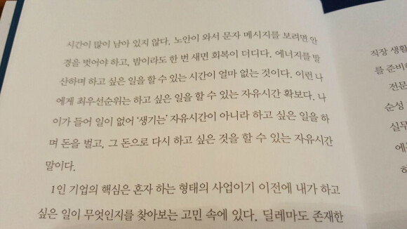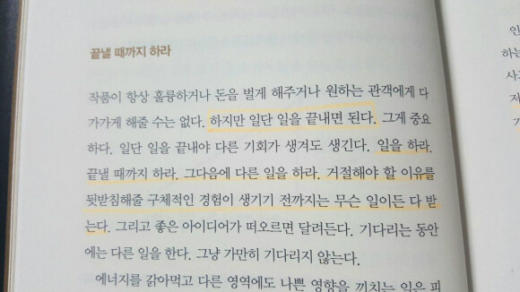 커리어를 DIY하라라는 문장이 마음에 꽤 오랫동안 여운을 주었다. 흔히 커리어는 쌓는 거라고 이야기를 많이 한다. 한 분야를 위해서, 혹은 취업을 위해서 그곳에서 원하는 부분들을 채워나가는 것을 스펙쌓기라고 부르니까. 그런데 커리어를 DIY하라고 말하는 것을 보니 아이러니하면서도 요즘 세상을 보면 충분히 가능한 이야기이기도 하겠다라는 생각도 한다. Do it yourself, 스스로 만들어가는 부분. 누군가가 어떻게 보든 내가 생각하는 대로 내 스타일을 적용시켜서 만들어가는 부분을 말하는 거니까. 앞으로 다가오는 세상은 '사'자가 아니라 '가'자가 온다라는 기사가 생각이 났다. 변호사/의사/판사 등 굉장히 전문가적인 직업들이 각광받는 시대였다면 앞으로는 화가, 작가, 음악가 등 문화와 예술 분야의 사람들이 각광받기 시작할 거라고 인공지능이 따라갈 수 없는 부분을 가지고 있는 직업들이 떠오를 거라고 했다. 현재는 문화예술분야는 사실 먹고사는 현실까지도 생각해야하는 많은 부분들이 있지만, 여전히 그 안에서도 자신만의 커리어로 자신만의 스타일로 승부를 보면서 세상을 살아가는 사람들이 있다. 이 책은 그런 부분을 정말 현실적인 조언과 함께 제시하고 있어서 생각을 많이 하게되었다.