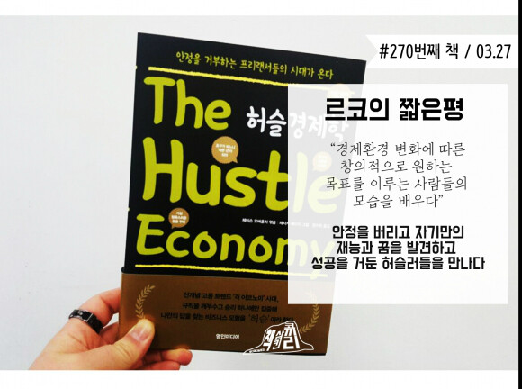 허슬경제학(The Hustle Economy) 이라는 이름만 들었을때에는 평상시 익숙하지 않은 분야였기때문에 - 경제학의 한 분야인가라는 의문으로 책을 접하게 되었는데, 안정을 거부하는 프리랜서들의 시대가 온다라는 부분의 부제가 마음에 들어서 뭔가 새로운 부분을 이야기하는 것 같다라는 느낌을 주는데 - 예전에는 기업/업체 등 어느정도 준비가 된 조직에서 고용하는 형태에 일이 많았다면 이제는 프로젝트성으로 고용되는 형태가 많아졌는데, 각자의 전문가들이 각자 필요한 상황에 모여서 업무를 해나가는 식, 얼마전 읽었던 "나는 1인기업가다"라는 책과 연결이 되어지면서 현재 경제흐름에 대해서 생각하게 되었다. 더이상 이론에만 존재하는 대로 우리가 움직이지 않음을 4차 산업혁명으로 인해서 사실 모두가 느끼는 것은 아니지만 이미 새로운 형태의 경제가 생겨났음을 알려주는 책이다. 새로운 형태의 경제는 누군가가 알려주지 않으면 혹은 먼저 걸어가면서 느낀 사람들이 알려주지 않으면 알 수 없다. 이 책은 허슬경제학 시대를 살아가는 우리에게 사실적으로 또 솔직하게 이야기를 해준다. 좋아하는 일과 잘하는 일과 새로운 일들 중 어떤 것을 내가 선택해야하는지에 대해서 누구나 고민을 하게된다. 지금 이시대 내가 어떤 방향으로 살아야할지 고민이 된다면, 이 책이 조금은 시야를 열어주고 현실적 생각들에 대한 방법을 생각하게 할 수 있을 것 같다.