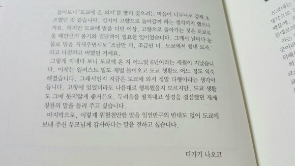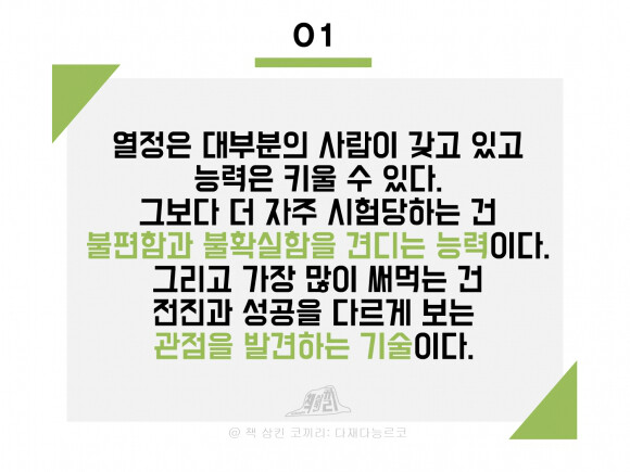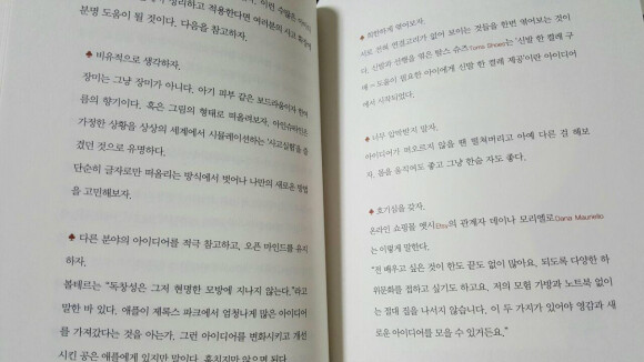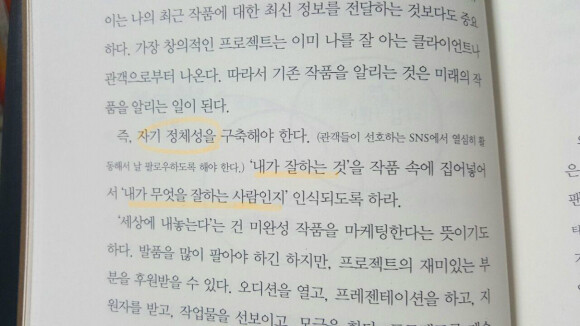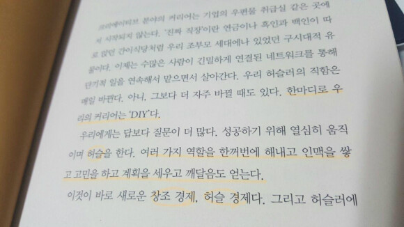 나 역시 꾸준히 나의 커리어를 쌓아가고 있다. 항상 객관적으로 삶을 돌아보고 또한 - 그 삶 속에서 내가 생각하지 못한 가치도 발견하고자 노력해왔기에 나도 차근차근 하나하나 만들어가고 있다. 이 책을 보면서 나는 다양하게 살아가는 사람들의 이야기를 마치 TED를 보듯, 세바시를 보듯 훌룡한 강의이자 조언들로 받아들이면서 배웠다. 현실을 함께 살아가는 사람들의 가장 현실적인 조언. '노력하면 될거야'라는 두루뭉실한 이야기가 아니라 이렇게 하다가 어려울 수도 있어. 그런데 나를 바꾸려고도 노력해야하고 변화도 해야하고 달라져야해. 그래야 살아남을거야. 그리고 꾸준히 노력해. 모두가 아니라고 해도 해봐. 그러면 또 다를거니까라고 이야기한다. 스스로 걸어가면서 느껴왔던 수많은 편견과 사람들의 판단이 이미 겪고, 겪고 있는 사람들이 해줄 수 있는 진짜 이야기가 담긴 책이였다. 단순히 창조적이게 살아가라는 부분만을 이야기하는 것이 아니라, 세상에 나만의 자리를 만들어가는 방법이나 내면을 경영하는 방법 등을 이야기하면서 새로운 시대에 필요한 것이 "수신제가치국평천하"라는 말을 이야기하는 것 같았다. 나를 내가 알고, 가족을, 조직을, 세상을 점점더 넓게 갈 수 있는 부분을 이야기했다. 대인관계가 좋지않아도 싫어해도, 어려워하는 그 일도 해야한다라고 직언을 하기에 - 지금 나에게 가장 필요한 부분들이 많아서 그리고 과정과 결과에 대한 이야기가 같이 담겨져있어서 나를 많이 돌아보게 했다.