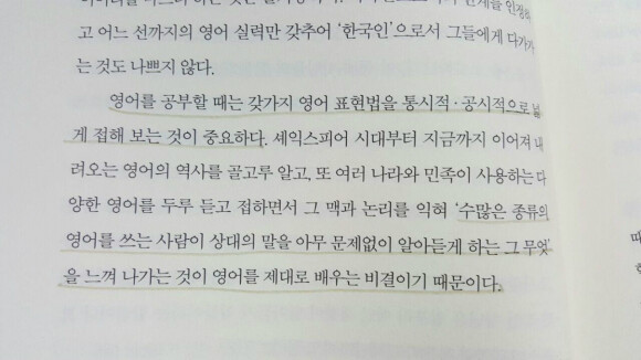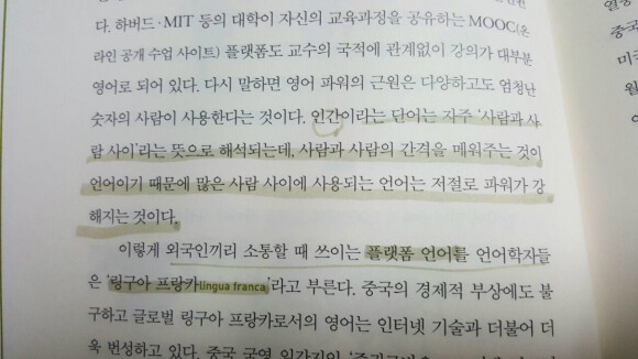 어린 시절의 그가 직접 겪은 이야기들을 통해서 영어에 대해서 이야기를 하고 있어서 조금더 이해가 쉽다. 왜 다른 사람들보다 쉽게 익히게 되었는지에 대한 부분과 똑같이 주입식교육으로 외움의 공부를 해온 그도 우리가 같은 실수를 했음을 이야기한다. 우리와 다른 문화를 가진 외국인들과 지식과 지혜를 나누면서 스스로가 성장될 수 있는 데에 '언어'가 얼마나 중요한 도구인지에 대해서 생각치 못했었다고 이야기한다. 그도 똑같이 노력하고 생각하고 바꾸어가면서 그 자리까지 올라갔다는 것이다. 천재라서가 아니라 '노력'을 했기에 얻은 부분임을 이야기한다. 나역시 언어를 배워야하는 이유에 대해서 단순히 그 언어가 잘하고 싶어서라기보다는 원문의 정보가 보고 싶어서가 시작이였던 것 같다. 이 책에서 말하는 바에 대해서는 사실 생각해본적이 없거나 혹은 저자의 말처럼 지배적 상황으로 언어를 받아들인 적이 많았던 것 같아서 꽤나 혼란스럽기도 하고 그간 영어가 쉽게 되지 않았던 이유에 대해서도 다시금 생각해보게되었다. 사람과 사람사이를 이어주고 메워주는 역할을 하는 언어이기에 어떤 언어가 많이 사용되느냐에 따라서 우리가 배워야할 부분들도 달라진다는 것이다. 플랫폼 언어인 "링구아 프랑카", 어쩌면 시간이 지나면 영어/중국어/ 또 그 외의 언어까지 우리는 3-4개국어가 기본 스펙이 되는 세상을 살아갈지도 모른다. 대세인 언어만을 배우는 것이 아니라 살아가는 데 있어서 필요한 플랫폼 언어를 익혀가는 상황들이 벌어지는 것이다.
