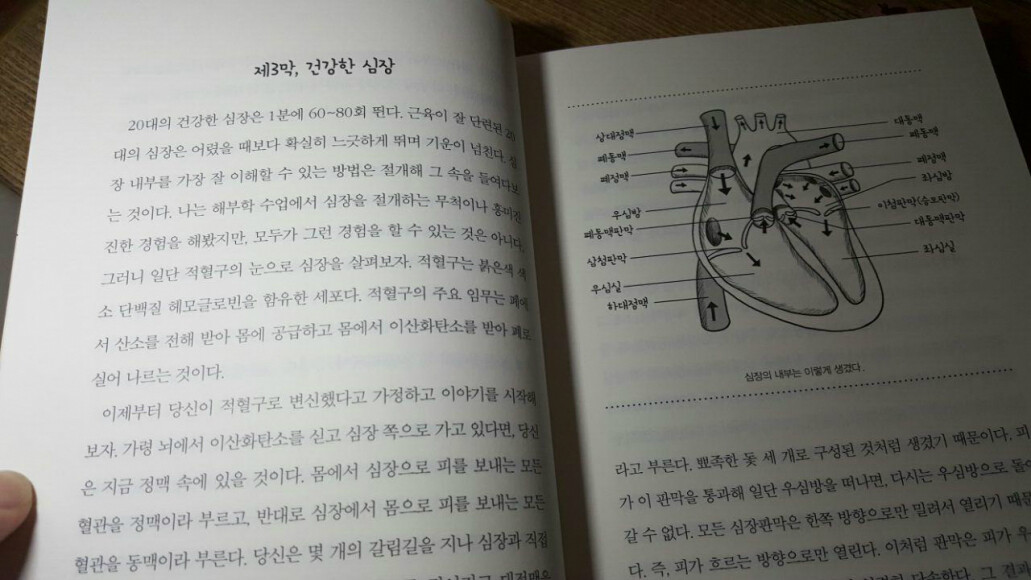 심장하면 흔히 떠오르는 단어는 '두근 두근' '쿵쿵쿵'이라는 의성어가 아닐까라는 생각이 가장 많이 들었다. 심장이 여행을 한다라는 것은 과연 어떤 부분을 보고 이야기를 하고 싶은 걸까 표지속에 드러나는 '심장'의 모습이 흥미롭게 다가온 것도 오랜만이였던 것 같다. 한창 의학드라마가 방영되고 있는 요즘 '삐..삐...삐--------'라는 단어만 들어도 심장이 멈춘다라는 것이 가장 와닿는 장면이고 내가 아는 심장의 전부이지 않을까 싶을 정도로 생명과 직결이 되어있다라는 것은 알고 있지만 사실 그 이상은 생각치 않는 부분중에 하나가 심장이지 않을까 생각이 든다. 가장 중요한 부분인데도 생각해보지 않았던 것이 오히려 의아할 정도로 이 책을 만나고 나서야 심장에 대해서 진지하게 느껴보게 되었다.