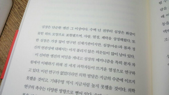 왜 주먹만한 우주라고 이야기를 했을까했는데 - 읽어나가다보면 눈을 못 떼겠고 아직도 경이로움을 금치 못할 만한 내용들이 많았다. 또한 그간은 나도 모르게 심장을 지치게 하고, 고장나기 쉽게 한 행동들도 많았음도 알고 또한 내가 겪은 증상들 안에도 이상증상이 있구나라는 생각에 다시금 건강에 대해서 생각해보게되었다. 어른들이 말하시는 것처럼 '돌도 씹어먹을 나이'라는 말이 거짓말이 아니란 점과 25세 이후부터 혈관에 쌓이기 시작하니 25세부터 꺽이는 거다라는 속설도 아주 틀린 말이 아니라는 점, 심장과 관련하여 삶을 보니 참 여러가지 의미가 있구나라는 생각까지 하게된다. 삶을 살아가면서 배우는 것들이 그저 너무 어려운 지식들이 아니라 살아가면서 생각해야할 것, 또한 살아가면서 지켜야할 것이라고 생각이 들다보니 삶의 가치도 돌아보게 하는 책이다.