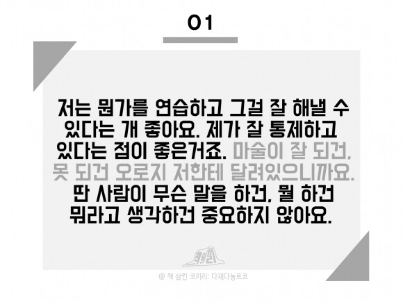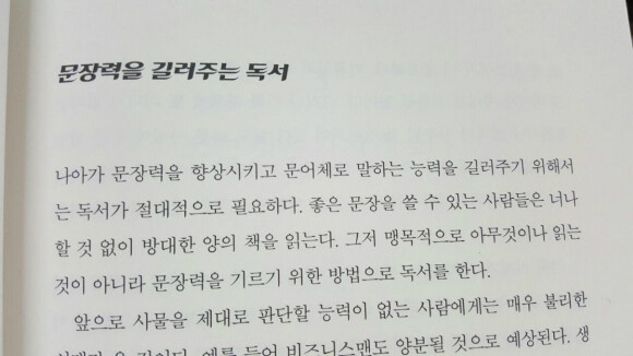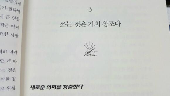 책이 얇고 글씨도 커서 한눈에 내용들이 들어오는 구조를 가지고 있어서 편하게 읽기에 좋다. 돌려서 이야기하기보단 직구를 던진다. 하루 쓸 목표량을 정하고 일정기간 꾸준히 쓰라고 분량에 대한 불안감을 해소하려면 원하는 주제로 글쓰기를 하라고, 기승전결을 쓰려고 하지말고 전승기결을 통해서 글을 쓰라고, 돌려 이야기하지 않으면서 독서능력을 달라지게 해주고 생각하는 힘을 키워주는 글쓰기에 관하여 2000자를 쓰라고 권유한다. 3-5장은 어떤 제약없이도 쓸수 있을지 몰라도 10장을 쓰려면 생각해야하고 또한 주제를 위한 구성도 해야하니까. 마치 운동을 할때 언제든 들수 있는 1kg을 들기보다 조금 무리인듯한 2kg를 들어서 조금씩 운동기구의 무게를 늘려 진짜 몸을 만들어가듯이 저자는 돌직구로 이야기하면서 글쓰기를 권유한다.