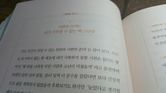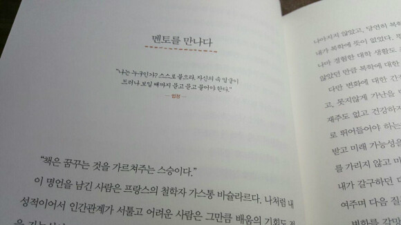 지금 무슨 책을 읽는지에 대한 질문으로 책이 시작한다. 문득 내가 읽고 있는 책을 다시 돌아보고 나도 나름대로 적립해온 독서법들을 돌아보기도 하였다. 다른 사람들과 비교하지 않고 나에게 맞는 속도대로 나아가게 해준 것도 책이였고, 누가 시키지 않았지만 어느새 습관이 되어서 평생 후회하지 않는 나의 습관중에 하나이기에 저자의 말에 하나하나 잘 공감이 되었다. 나에게 독서는 '멘토'였고, '친구'였다. 가장 힘이 든 순간 더 힘든 순간에도 일어난 이들을 보면서 나는 나약하지만 하다보면 되겠지라는 마음을 끊임없이 열어준 것이 독서였기 때문이다. 공부를 잘 하는 편은 아니였지만 그래도 포기하지 않게 해준 것도 책이였다. 저자의 삶을 보면서 그의 인생에서의 '책'은 정말 특별했겠구나 공감하기도 하고 나의 경험들도 많이 떠오를 수 있도록 도와주었다.