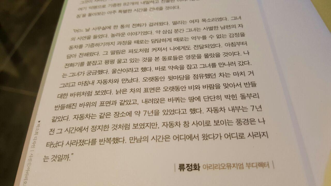 이 책은 사실 누군가의 이야기가 아니라, 누구나의 이야기를 다루고 있다. <실연의 박물관>이라는 글로벌 전시기획을 통하여 한국에서 기증된 82개의 헤어짐에 관한 이야기 였다. 일반적으로 헤어짐이라는 단어는 사실 '긍정적'이라고 표현되기에는 참 어둡다 또한 슬프다라는 표현이 가장 잘 어울리곤 한다. 그런 헤어짐이 하나의 박물관에 모여서 또다른 이야기가 되어질 수 있을까? 하지만 이 책의 날개에 나오는 하나의 이야기만으로도 나는 이책을 읽어야할 수만가지 이유가 떠올랐다. 이 세상 다시 없을 것 같았던 혹은 사랑이고 애증이고 그리움이라는 또다른 이름들로 가득한 헤어짐이라는 문을 열어보게 되었다.