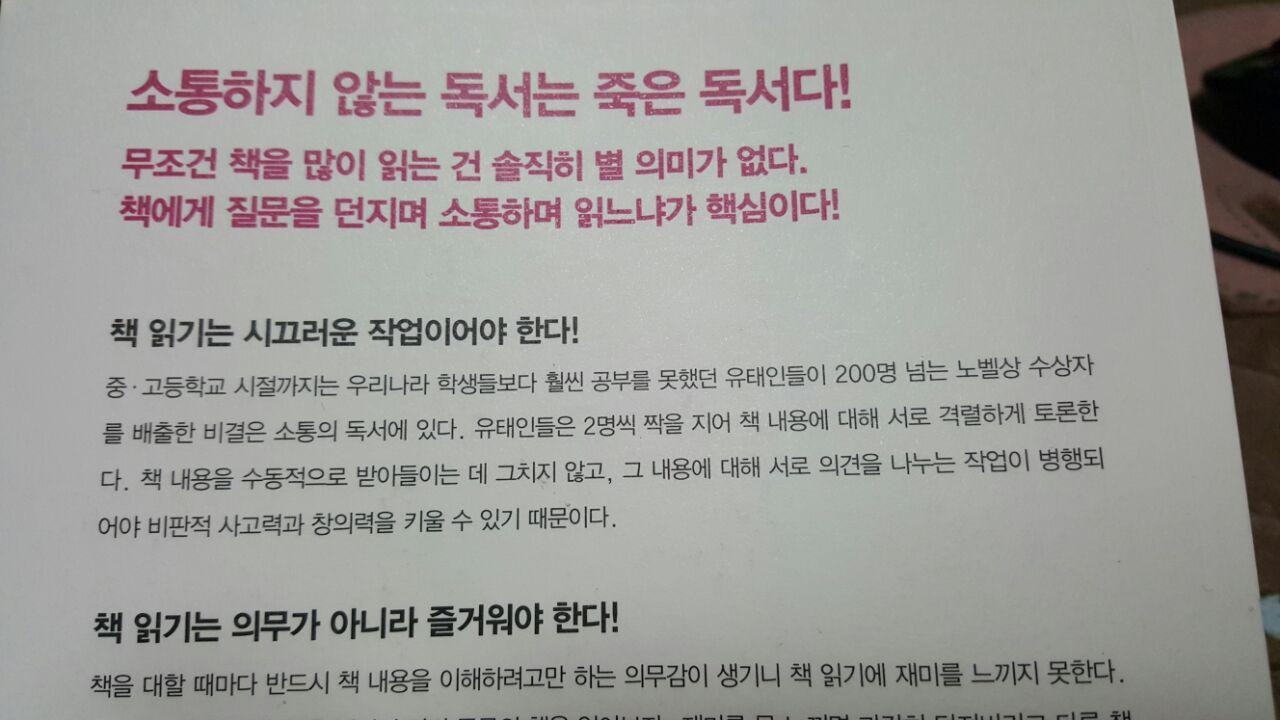 독서를 좋아하는 1인으로서 사실은 이책은 꼭 읽어보고 싶었다. 책이라는 것이 읽으면 읽을수록 더욱 읽고 싶고, 정말 열일 다 제치고 독서만 할 수 있는 시간이 있었으면, 혹은 독서를 통해서 이익창출만 된다면 24시간 책만 읽고 싶은 1인이기도 하다. 시간이 지날수록 독서는 점차 매력을 더해가고 있기에 제목에서 말하는 50가지를 다 가지고 싶어서 행복한 느낌으로 책을 폈다. 독서모임을 하고 있는데, 160여명의 회원분들이 각자 읽는 스타일을 보면 참 다르구나 싶었는데, 이 책은 들어가는 부분부터 또다른 책의 부분을 이야기해서 흥미로웠다. '책읽기는 시끄러운 작업이여야한다'. 저자는 철학자로서 이미 나를 성장시키는 독서법이라는 책을 냈고, 그 이후 5년간 지론도 변함이 없었지만 그간 변화가 일어난 부분들을 쓰게 되어 이전책의 개정판이라고 이야기를 했다. 그러면서 유대인의 독서법 중 하나인 '하브루타'를 꺼냈다. 조용한 곳에서 읽는 것이 대부분 맞다라고 생각한 통념과는 달리 생소하지만, 요즘 한창 유행하는 것이기에 또한 독서모임을 통해서 생각을 나누는 부분이 얼마나 중요한지 알기에 - 공감을 하면서 책을 읽기 시작했다.