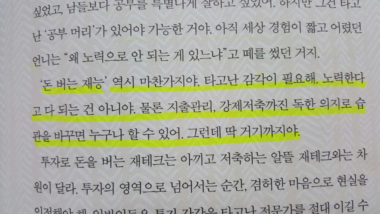 대한민국의 평범한 엄마라서 그녀의 마음이 더 절실하게 와닿는 엄마의 돈 공부, 사실 재테크에 관련한 책은 많지만 그 재테크를 하면서 느낀 마음 혹은 그 이전의 삶, 재테크를 할 수 밖에 없다고 느낀 마음, 실패의 경험 등을 다루고 있는 책은 흔하지 않은 것 같긴하다. 대한민국에서 부자가 되는 조건 3가지, 부자 부모가 없어서, 부자 남편이 아니였기에, 로또에 당첨되지 않아서 자신은 자신의 삶에 맞는 부자가 될 수 있었다고 이야기하는 그녀의 말이 참 색달랐다. 누군가는 가지지 못한 것을 바라보면서 이야기할 지 몰라도 그녀는 자신의 삶에서 이것들이 없었기에 자신이 부자가 될 수 있었다고 말하면서, 자신의 인생에 아무것도 이유없이 일어난 것은 없음을 이야기 한다. 게다가 이 책의 서두는 부자가 되려면 부자 그릇을 만들어 두지 않으면 갑자기 들어온 돈이 있다한들 활용치 못하고 떠나보내야함을 이야기해준다. 부자가 되기 위한 부분에 필요한 것은 마음가짐인 것 같다. 돈을 버는 방법도, 물론 끈기와 인내도, 공부도 다 필요하지만 - 부자가 되고싶은 마음, 되야하는 마음, 부자들이 가진 가치관들을 충분히 돌아볼 필요가 있는 것 같다. 이러한 그녀의 이야기가 엄마가 아니라 생존을 위한 고군분투 했던 한 사람의 일기 같아서 더 읽게 되었다.