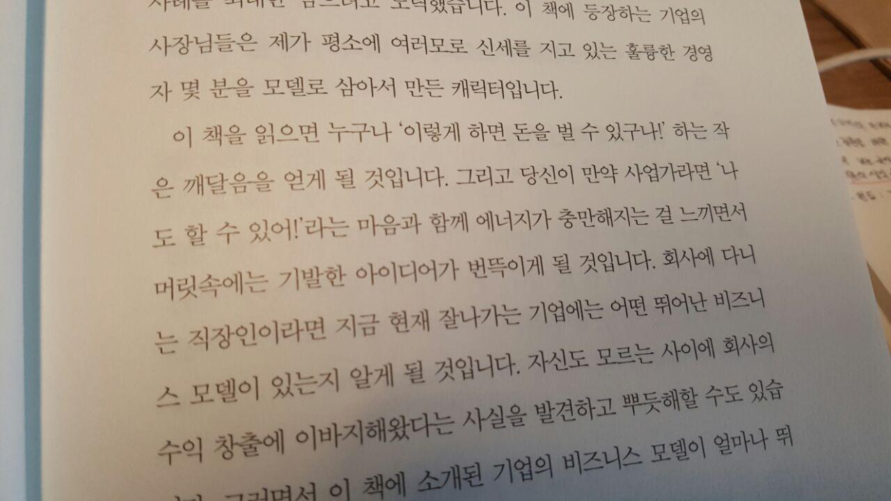돈 버는 일에도 디테일이 필요하다는 점을 들면서 시작하는 이 책은 돈이 벌리는 구조에 대해서 이야기를 하고 있다. 경영이란 것이 노력한다고 수익이 나는게 아니라 성공한 기업들은 돈을 버는 비즈니스 모델을 사용하기 때문이라고 이야기한다. 바둑에 정석처럼 사업에도 묘수가 있음을 알아야한다고 강조한다. 성공하기 위한 전략이 존재하며 그 전략을 실행한다면 누구나 돈을 벌 수 있다라는 것이다. 저자는 자영업을 하는 부모님을 통해서 배우고 자랐으며 20대 후반부터 컨설턴트로서 쓰러지는 기업을 회생시키고 연 매출 제로에서 700억원대까지 끌어올린 적이 있다고 한다며 지금도 비즈니스 모델 강좌를 하는 자신의 노하우를 바탕으로 사람들이 익히고 또 배울 수 있도록 이 책을 썼다. 특이점은 일반적으로 성공법칙을 알려준다면 이렇게 하면 이런 부분들이 생기고 이게 내 노하우입니다라는 구조가 아니라, 마치 '소설'처럼 등장인물과 이를 돕는 컨설턴트가 엮이는 부분들을 사용해서 하나하나 디테일들을 전하고자 하는 진행을 전개가 되는 것이 신선했다.