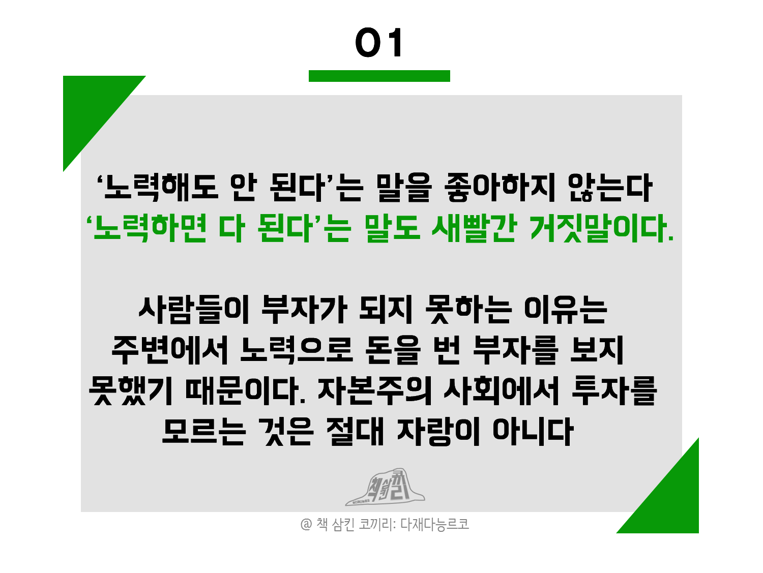 노력해도 안된다는 말을 좋아하지도 않지만, 노력하면 다된다는 말도 새빨간 거짓말이다. 사람들이 부자가 되지 못하는 이유는 주변에서 노력으로 돈을 번 부자를 보지 못했기 때문이다. 자본주의 사회에서 투자를 모르는 것은 절대 자랑이 아니니까, 대한민국의 금융문맹은 3명 중 2명 단순히, 돈을 버는 방법을 모르고 절약하는 의지가 약한 것이 아니라 말그대로 진짜 몰라서 부자가 되지 못하는 상황을 말하며, 돈의 가치를 모르고 사용하는 부분까지를 말한다. 재테크를 무시하고, 돈을 경시하며, 심지어 죄악시하는 사람은 결코 부자가 될 수 없다. 돈의 노예가 될 것인지, 돈의 주인이 될 것인지에 대한 진지한 고민이 필요하다. 각자 저마다의 이유로 재테크를 하는데, 결국 하고자하는 일을 하려면 '돈과 시간'은 마치 패키지 같다. 하고 싶은 일을 위해서는 '돈'이 필요하다. 결국 내가 돈을 버는 이유가 '나의 인생'의 모습인 것이다. 그때에 가장 중요한 것은 그간 주변에서 들어오거나 보아온 재테크의, 투자의 고정관념을 지워야한다는 것이다. 노력해서 다되는 것은 아니지만, 노력해서 안되는 것은 없다. 다만 그 노력에 들어가기전에 '리셋'이 필요하다. 이럴것이다 저럴것이다 어떤 문제에 관하여 같은 생각만 반복한다면 지금보다 나아지는 것은 존재할 수 없다.