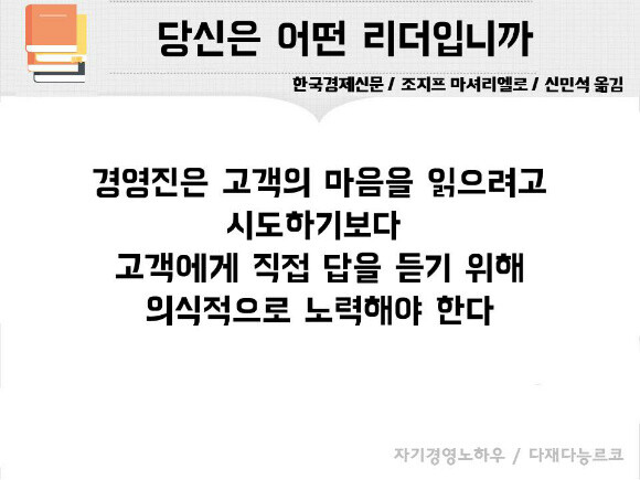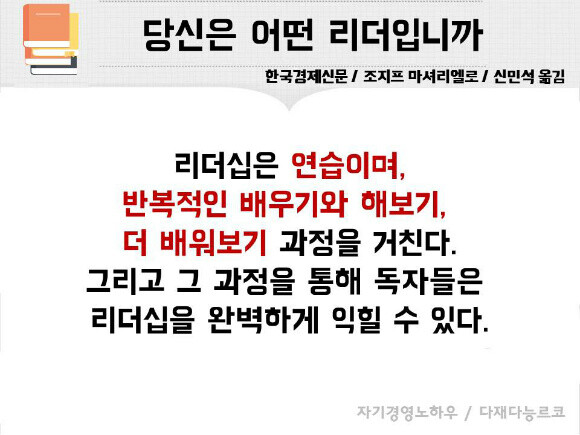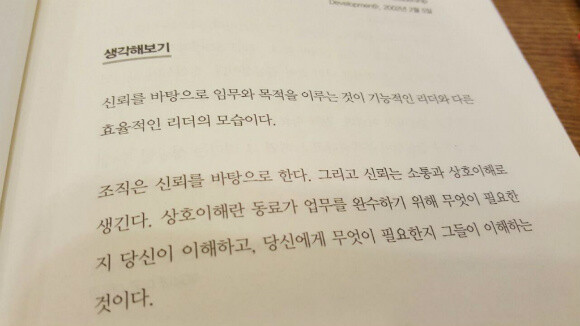 읽으면서 생각을 해보게 되니 그간 부족한 부분 혹 나의 리더였던 분들을 돌아볼 수 있었다.
