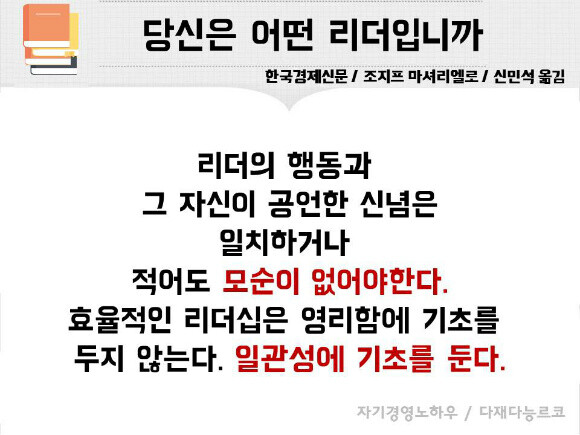 책의 내용을 가지고 언행일치를 한다면, 좋은 리더다라는 말을 듣게해줄 책.