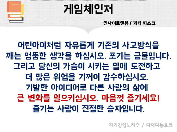 세상의 게임의 룰을 바꾸는 게임체인저가 되어보라.