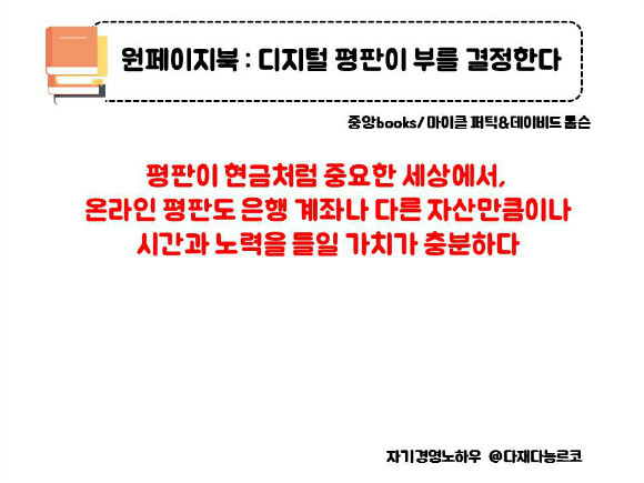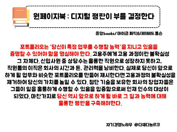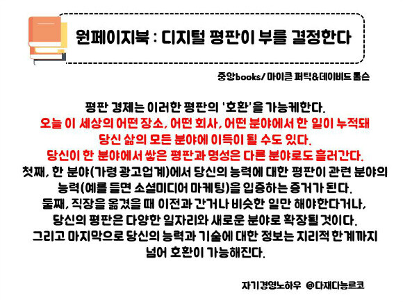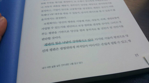 점점더 막강해지는 디지털 평판에 대해서는 당연히 고개를 끄덕일수밖에 없는 것 같다. 조금씩이지만 분명하게 삶에 전체에 변화를 일으키고 있는 것도 맞다. 어느 누군가는 유투브를 통해서 돈을 벌고, 페이스북 스타가 되어 돈을 번다. 어제는 평범했을 누군가가 외국 신문 기사에 거론되기도 한다. 온라인은 더이상 그저 사이버 공간이라고 말할 수 없을 만큼 성장했다. 이 책에서 처럼 온라인이라는 공간이 또다른 포트폴리오가 되고 또다른 이력서가 되기 시작했고, 이러한 형태의 앱이나 사이트가 증가하고 있음과 전혀 상상도 못했던 한국인이 인터넷에 올린 디자인 덕에 외국계 기업으로 취업이 되는 기사가 나타나는 현재의 사건들이 그를 대변하는 것이 아닌가 싶었다. 이제는 진짜 디지털 평판을 무시할 수 없다. 이를 인해 나 또한 성장하기도 하고 달라지기도 하고 부를 얻을 수도 있다. 이제는 온라인도 관리를 해야하는 시대임에 동의를 할 수 밖에 없었다. 많은 부분을 배우고 느낄 수 있었던 책이였다.