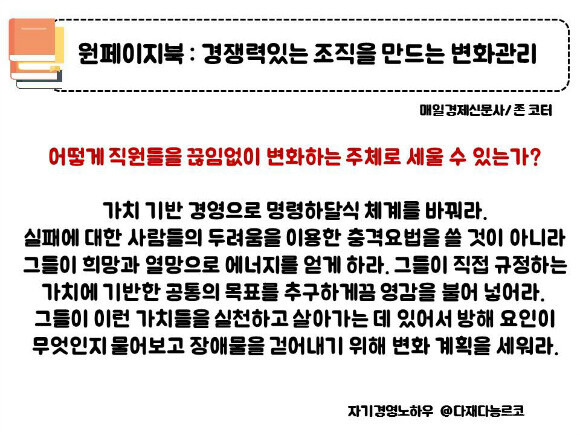 은 점은 단순히 이렇게 하라라는 지침서라기보다는 아이디어와 방법, 그리고 실수할 수 있는 부분들을 함께 이야기를 해주는 부분이였다. 이론이라서 어렵다라고 생각할 수 있지만 조직이라는 부분들이 각자의 환경과 가치관, 슬로건마다 방법이 다르다는 점을 생각한다면 이는 굉장히 좋은 이론서였다. 내용을 생각하면서 진행하고 유의하면 확실하게 도움이 될 수 있는 부분들을 간결하게 이야기했기에 더욱 실질적으로는 괜찮은 글들이라고 생각되었다. 게다가 다시한번더 정리를 해줌으로서 아이디어를 실행하는 부분들을 다시한번더 입력하면서 생각할 수 있도록 해준다.
