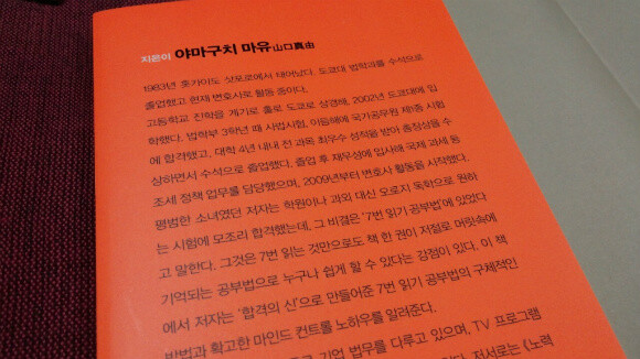 사실 평상시 책을 읽을 때 좋아하는 작가들을 보긴 하지만 이력에는 많은 신경을 안쓰는 편이긴 했는데 이 책의 저자인 야마구치 마유씨의 이력은 화려하다 못해 빛이 나는 이력이였다. 도쿄대 법학과 수석졸업, 대학 재학 중 사법시험 , 1급 공무원 시험 동시 패스! 라는 이력은 누구나 얻을 수 있는 이력은 아니니 말이다. 마치 우리나라 고승덕 변호사가 생각나기도 했다. 게다가 학원이나 과외대신 오로지 독학으로 원하는 시험에 모조리 합격했다라는 점도 또한 새롭기도 하고 부럽기도 하고 그리고 스스로 하는 일에 더욱 도움이 되기도 하겠다 싶었다.