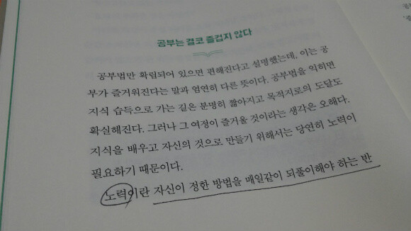 책을 읽어가는데 앞부분을 읽어가면서 들은 생각은 그저 공부를 이렇게했다, 나는 이랬다라는 수기식이 아니라 진짜 저자가 느낀 그대로 노하우를 전달해주려는 체가 마음에 들었다. 보통 노하우를 전하면 대부분이 에세이식이거나 일기처럼 자신의 스토리를 전하고자 하는게 보통인데 이 책은 하나하나 내용을 주려고 노력한다. 그렇기에 단순한 공부법을 자랑하거나 스스로 처한 상황을 자랑하는 것도 감정적인 내용만 들어간 것도 아니고 '정말 단순한 논리'를 설명하기위해서 예도 들어가면서 설명해준다. 어떻게 보면 어렵고 힘들 수도 있는데, 저자는 이 책을 읽고 공부법을 배우고 싶어하는 사람들이 마음을 바꾸고 생각을 바꾸고 공부법을 시도해보기를 원한다는 느낌을 받았다.