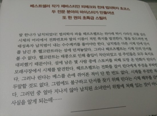 스릴러라는 장르를 싫어하진 않지만 잔인한 내용이 내게 읽기 쉽지는 않았다. 그렇다고 중단할 수도 없는 책이었다.