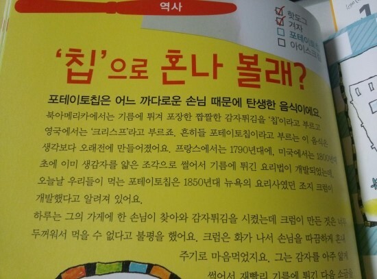 우리가 좋아하느 포테이토칩이 어느 까다로운 손님 때문에 탄생한 음식이랍니다. 손님이 감자튀김이 두껍다고 불평을 해서 감자를 아주 얇게 썰어서 재빨리 기름에 튀긴다음 소금을 뿌려 냈더니 손님이 무척 맛있게 먹었답니다.
