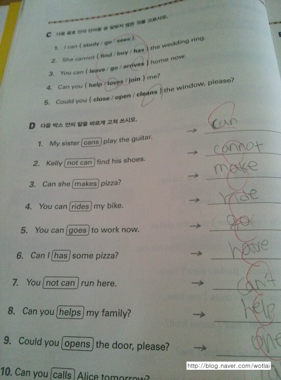 can, may, must, should 등과 부사 현재진행형, 시간과 위치전치사등 다양하게 배우게 됩니다.