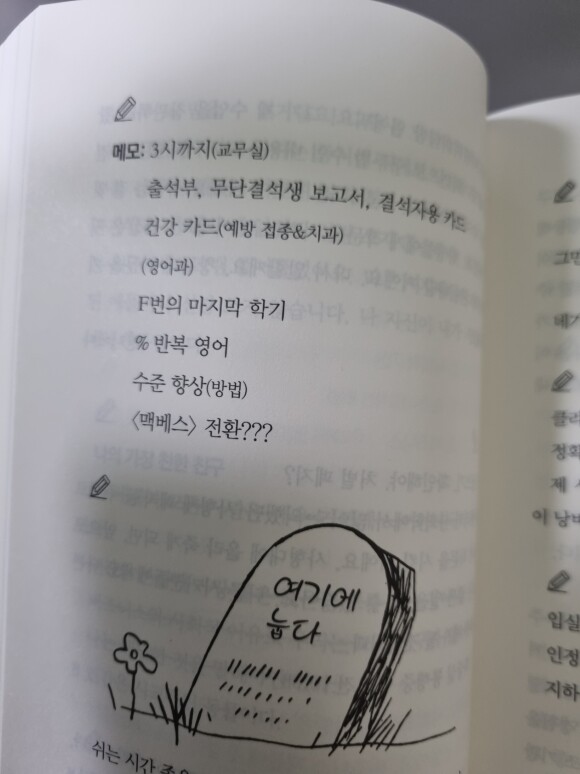 현실 속에서 보여지는 교육현자을 보게 되었다. 이미 오래전 쓰여진 소설이지만 지금의 교육 현실과 너무도 많이 닮아 있다. 교사 본연의 역할보다 매일맹리 쳐내야하는 또 다른 업무는 자신이 교사인지의 정체성의 혼란마저 가져 올것이라는 생각이 들었다. 지금 한국 교육 현실과 빗대어 볼때 배릿 선생님과 같은 사명감이 있는 교사가 몇이나 될까? 그럼에도 불구하고 기대를 하게 되는 이유는 아직은 그래도 희망이 있기 때문이다.