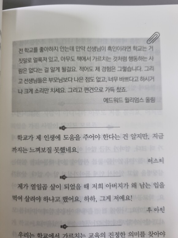 책을 읽으며 들었던 생각이 학생들만 문제일까?라는 것이다. 시스템의 문제이고 바르게 가르칠 수 있는 교사의 부재이고, 행정적인 부재 역시도 그리고 기존의 어른들의 사고의 낙후성이 물러온 총체적 문제라는 생각이 들었다. 배릿 같은 선생님이 계신다면 아이들에게는 행복한 학교 생활이 되지 않을까? 아이들을 생각하는 학교였다면, 배릿 선생님과 같은 교사들이 많았다면 아이들이 더 행복했을 것이다. 과중한 업무로 인한 시간을 빼앗긴 교사들은 자신의 정체성에 대해 고민할 수밖에 없었을 것이다. 교사로서의 가르침보다 다른 업무에 치이는 교사들, 소설에서만의 이야기는 아니다. 지금 우리나라도 그렇지 아니한가. 그러나 정체성의 혼란은 당연하다.