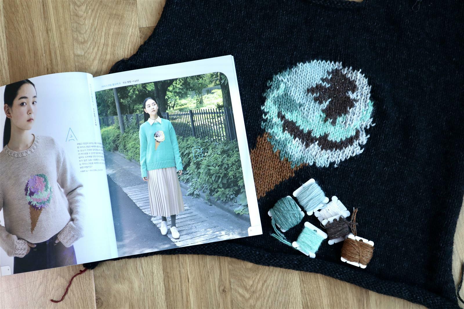 이 책에 실린 작품들 중에서 가장 먼저 눈에 들어온 아이스크림 풀오버를 뜰 실을 고르는 과정은 너무너무 즐거웠어요.☺️ 원작이랑 느낌이 달라도 색과 소재에 변화를 주어서 나만의 아이스크림 풀오버를 뜨겠다고 생각하니까 실 고르는게 너무 즐겁더라구요! 아이스크림이 스웨터의 포인트니까 반짝이가 잔뜩 들어가 옷 전체에 쓰기엔 부담스러웠던 실, 예쁘지만 색이 너무 튀는 실 등등 그 동안 꺼내지 못했던 실을 과감하게 잔뜩꺼냈어요. 게이지나 굵기도 비슷하게만 맞추고 딱히 신경쓰지 않았더니 마음이 아주 편안한거 있죠?😆(게이지가 조금 달라서 아이스크림이 울퉁불퉁해도 그것도 그대로 입체감있게 보이지 않을까 하는 생각이었어요.)