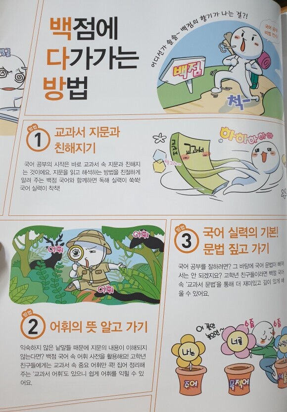 책을 펼쳤더니 백점에 다가가는 방법이란 이름으로 재밌게 국어 학습방법을 알려주고 있어요.