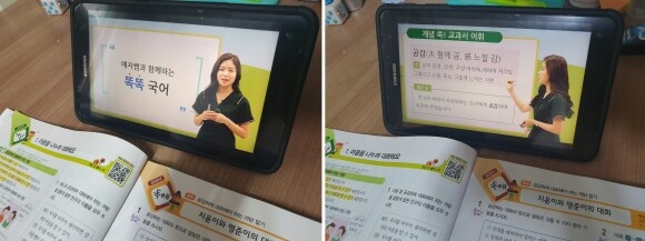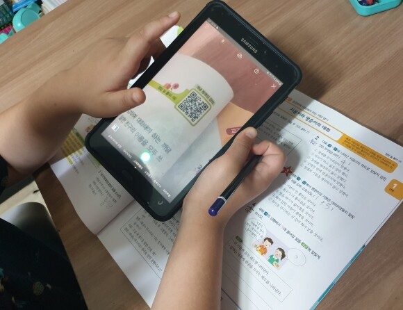 저희 아이의 경우 노트북과 연결된 TV로 동아출판 홈페이지를 통해서 선생님 강의를 느긋하게 시청하기도 하고, 문제를 풀다가 개념이 막혔을 때와 같이 급하게 강의도움을 받고 싶을 때는 태블릿으로QR을 찍어서 바로 보기도 해요.
