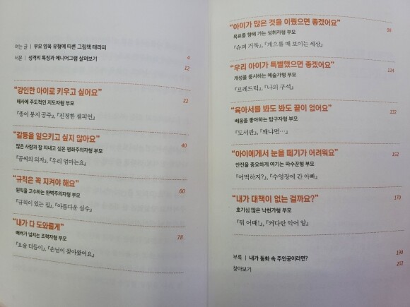 한 유형별로 끝나고 나면, 질문으로 내 마음을 반짝켜기라는 코너로 하나의 사건을 어떻게 풀어나가야 할지, 부모라면 누구나 겪을수 있는 문제상황들에 대해 친절하게 답해주는 부분이 있어서 더욱 도움이 되더라구요.